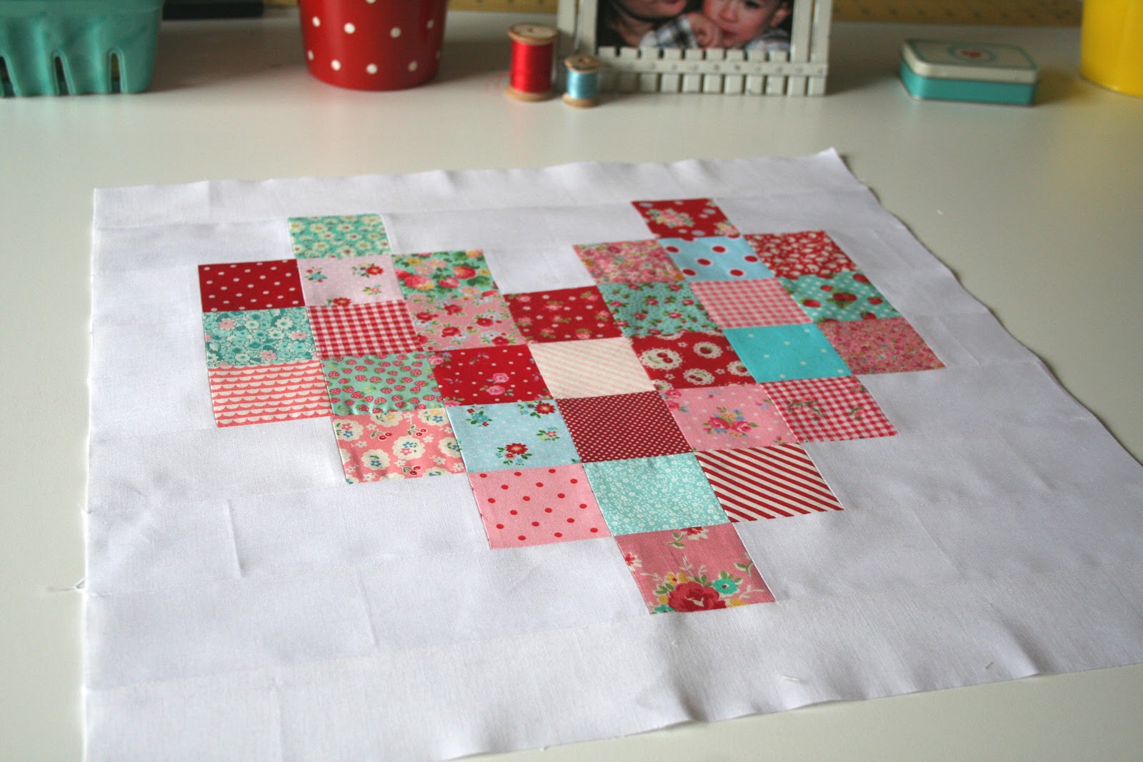 This week I did a patchwork heart pillow for a sweet friend of mine who's birthday is today on Valentines Day. I thought it would be fun to do a Valentines/birthday pillow. The pillow is inspired by this heart quilt. In case you'd like to make one in the future I have some instructions and measurements for you, as it really is simple.